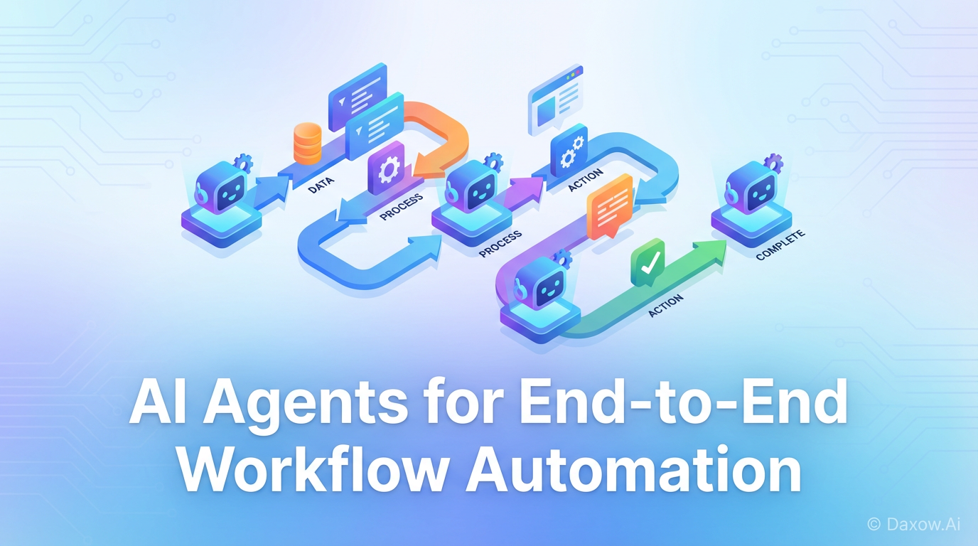 Practical guide to AI agents that automate end-to-end workflows, covering document extraction, orchestration, integrations, ROI, and implementation steps from Daxow.ai.
